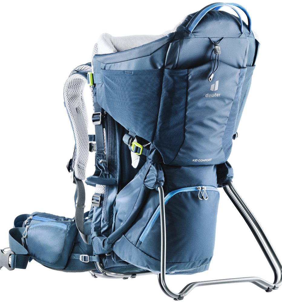 Take the whole family on mountain adventures with the Deuter Kid Comfort child carrier. It offers easy carrying, keeps parents' backs fully ventilated and has plenty of rest options for passengers. Deuter's Aircomfort Sensic Vario backsystem of airy, durable mesh is tensioned on a flexible spring steel frame resulting in maximum ventilation on 3 sides for 25% less perspiration. Designed with an arched profile, the frame transfers up to 70% of the load seamlessly into the ergonomic hip fins for effective load transfer and energy efficiency. Weight within the carrier is transferred perfectly due to flexible, movable Vari-Flex ECL hip fins and the Vari-Slide back length adjustment system. Vari-Flex pivoting articulated 3D hip fins are ultra-padded and made of multilayered, PE-stiffened foam to respond to the wearer's movements.The shoulder straps feature load-adjustment straps at shoulders and a height- and width-adjustable chest strap.
