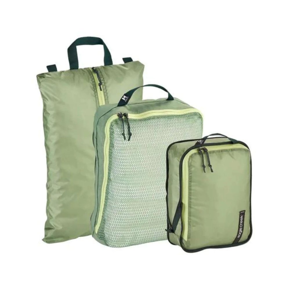 The Pack-It® Essentials Packing Cube Set is a trio of multitaskers that protects clean clothes from dirty gear and helps you pack more. Squeeze shirts, underwear and socks into a space-saving compression cube. Separate clean from dirty clothes and easily spot items using the mesh-topped, dual-compartment Reveal cube. Even dirty shoes stay segregated thanks to the Shoe Sack. Plus, the water-resistant, 100% recycled fabrics always make clean-up easy.