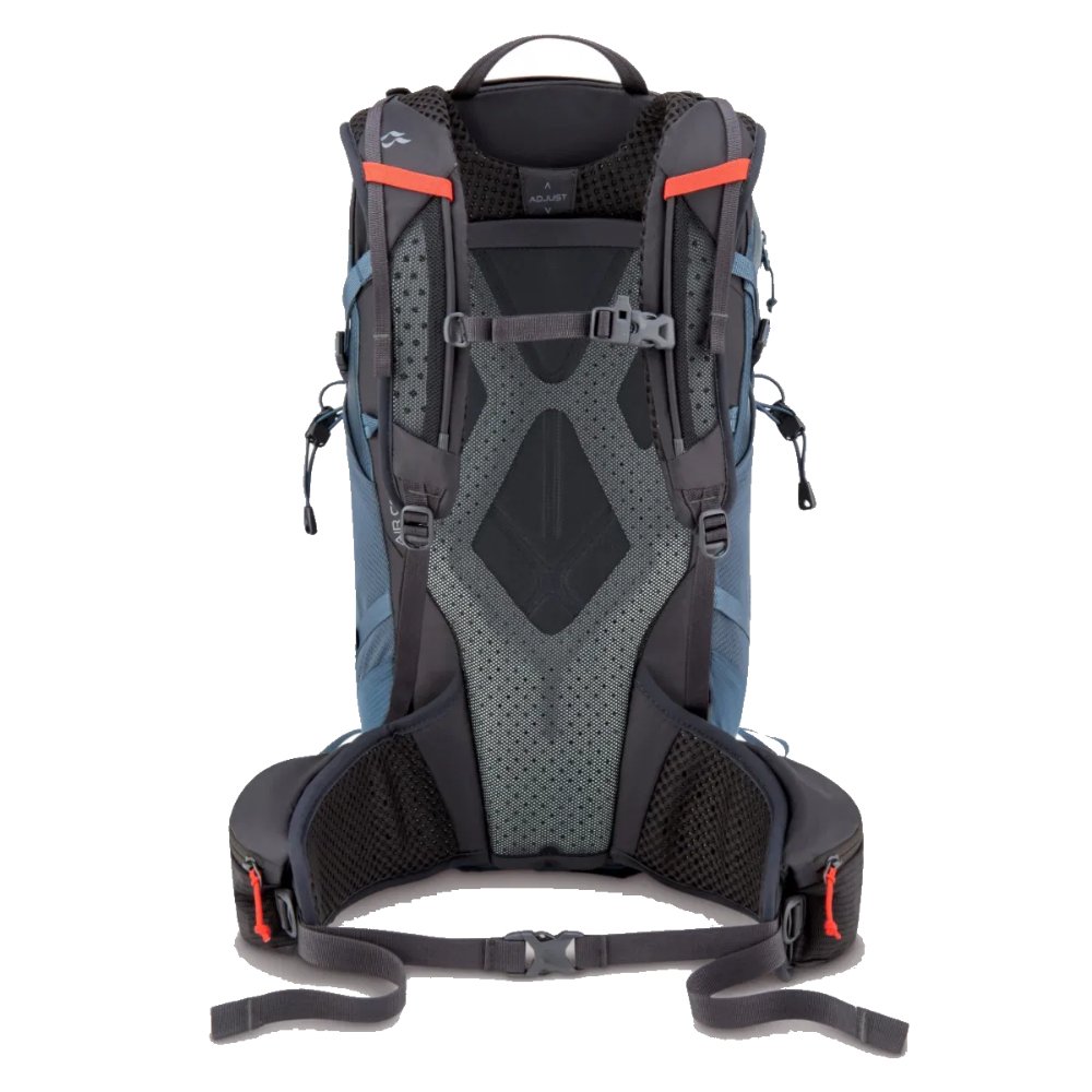 Vacuum formed, precurved and moulded ABS back panel with semi-rigid structure. Maintains the shape of the pack while flexing with the body.