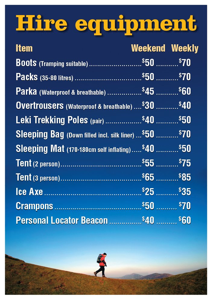 Tramping Pack Hire - from 35-80 litres in volume. Men's and women's specific harnesses to choose from. Custom fitted in shop.